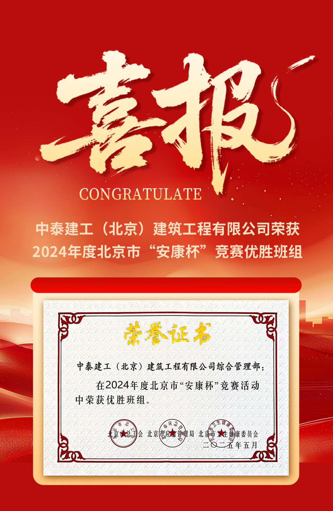 克日,北(bei)京(jing)市(shi)总工(gong)(gong)会、市(shi)应(ying)急办理(li)局、市(shi)卫生安康(kang)委员会结合(he)发布(bu)北(bei)京(jing)市(shi)“安康(kang)杯(bei)”比(bi)赛(sai)勾(gou)当成果(guo)的(de)传递(di),中泰建(jian)工(gong)(gong)(💙北(bei)京(jing))修建(jian)工(gong)(gong)程无限(xian)公司综合(he)办理(li)部荣获2024年度北(bei)京(jing)市(shi)“安康(kang)杯(bei)”比(bi)赛(sai)优越班组(zu),这(zhei)不只是对公司宁(ning)静(jing)出产任务的(de)高度承认(ren),更(geng)是对全部员工(gong)(gong)践行宁(ning)静(jing)理(li)念、共筑宁(ning)静(jing)防地的(de)活泼解释。